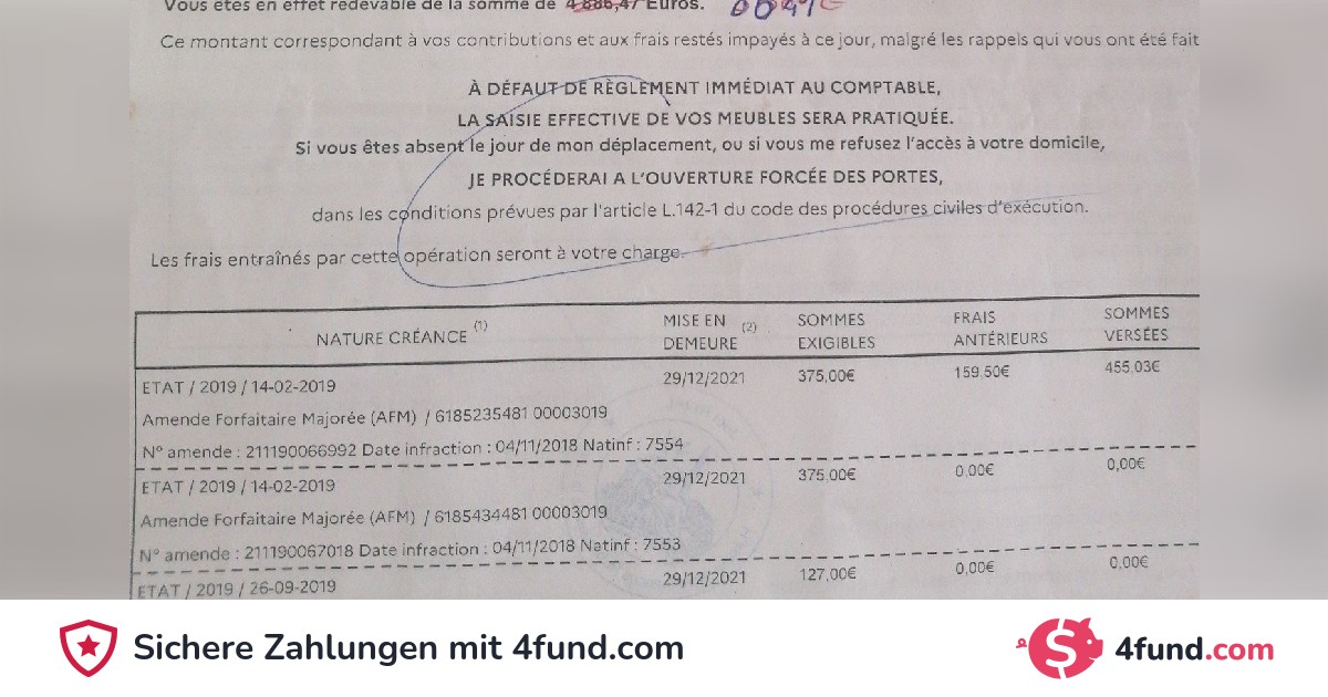 Ich bin wirklich nicht in der Lage, diese Summe zu zahlen, die außerdem größtenteils aus dem Covid stammen und wirklich ungerecht sind, oder ich werde 15 Jahre brauchen ich verdiene ungefähr den Mindestlohn ich bin verheiratet und werde eine kleine Tochter haben diese Bußgelder sind wirklich ein großes Problem für mich der Gerichtsvollzieher droht mir, meine Tür aufzubrechen und das Finanzamt gewährt mir nur einen Zahlungsplan über 12 Monate in Höhe von 740euro pro Monat, den ich natürlich nicht zahlen kann es weigert sich, mir einen kleinen Zahlungsplan zu machen, der Jahre dauern würde.