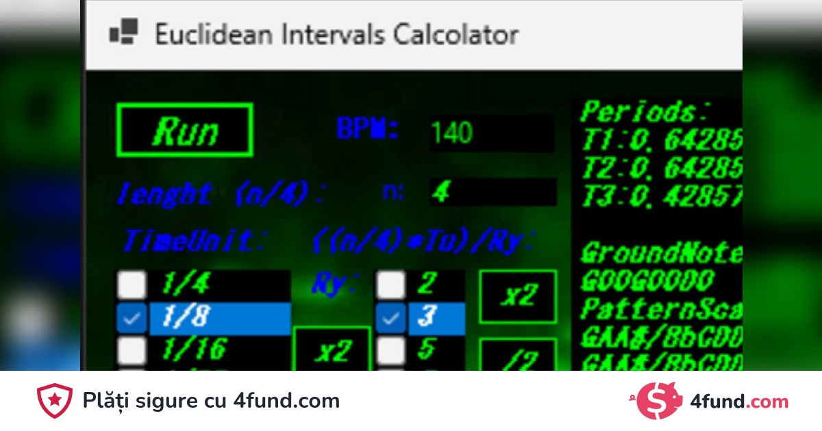 Acest software ajută muzicienii să calculeze intervalele euclidiene din subdiviziunea euclidiană a ritmului. În imagine sunt etapele inițiale, dar este nevoie de mult mai multă muncă pentru a-l face utilizabil pentru toată lumea. Dacă sunteți pasionat de compoziție și doriți să faceți o donație, contactați-mă pe Instagram dgrfnc9 pentru o versiune beta a software-ului.