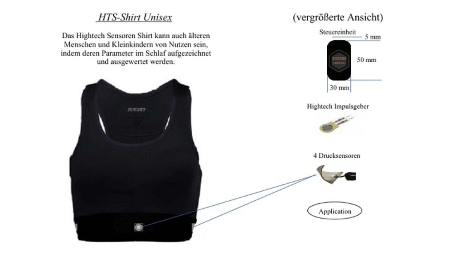 Inovatívny odev na hornú časť tela pre zdravý spánok, ktorý je vybavený 4 minisenzormi tlaku, generátorom pulzu, miniatúrnou riadiacou jednotkou a mikroakumulátormi.