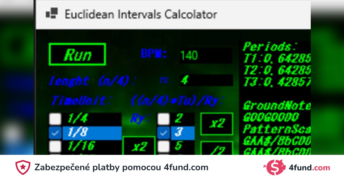 Tento softvér pomáha hudobníkom vypočítať euklidovské intervaly z euklidovského delenia rytmu. Na obrázku sú počiatočné fázy, ale je potrebné ešte veľa práce, aby bol použiteľný pre každého. Ak ste nadšenci kompozície a chceli by ste prispieť, kontaktujte ma na Instagrame dgrfnc9, kde získate beta verziu softvéru.